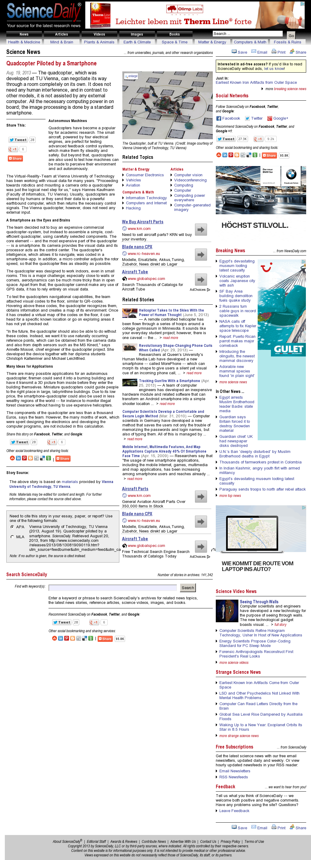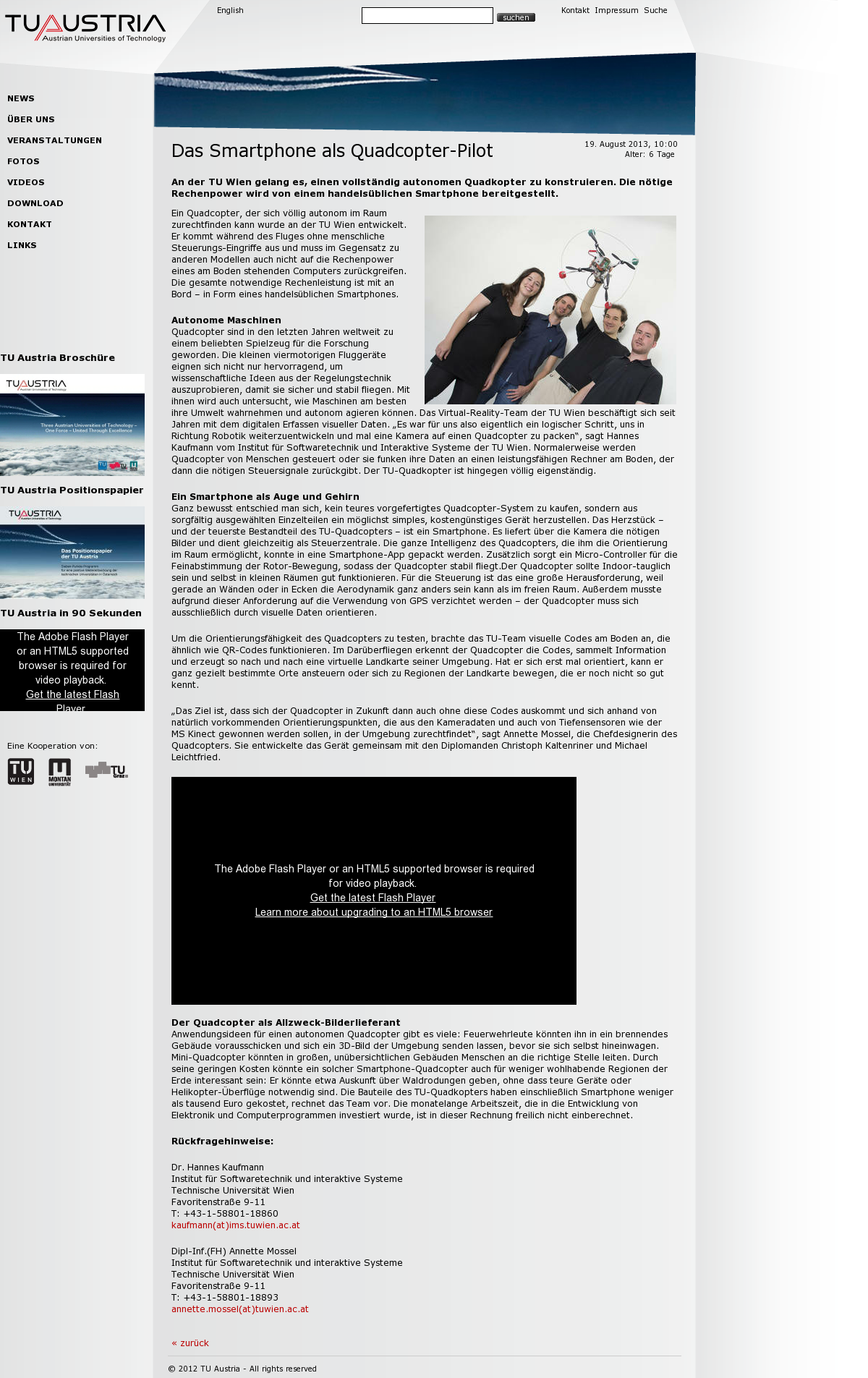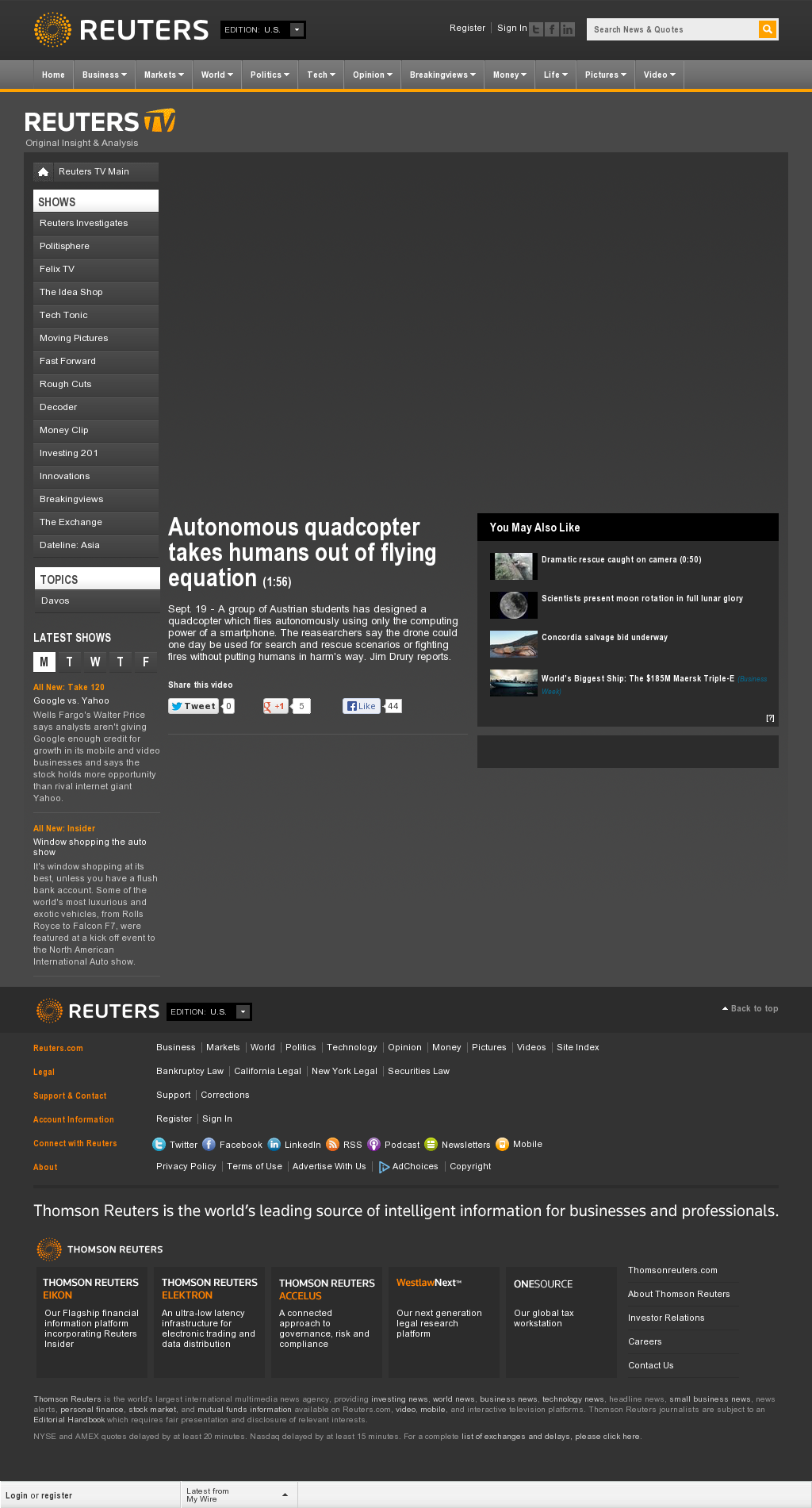 | REUTERS TV | Autonomous quadcopter takes humans out of flying equation Sep 19, 2013 | SmartCopter | Screenshot |