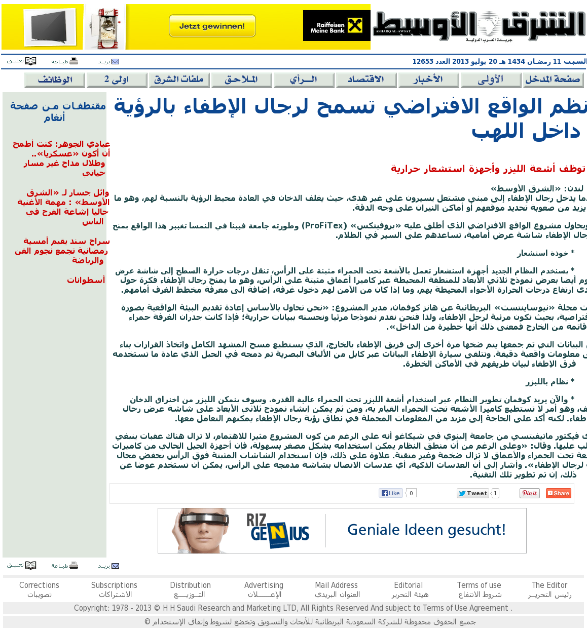 | Aawsat.com (Arabic) | نظم الواقع الافتراضي تسمح لرجال الإطفاء بالرؤية داخل اللهب Jul 20, 2013 | ProFiTex | Screenshot |