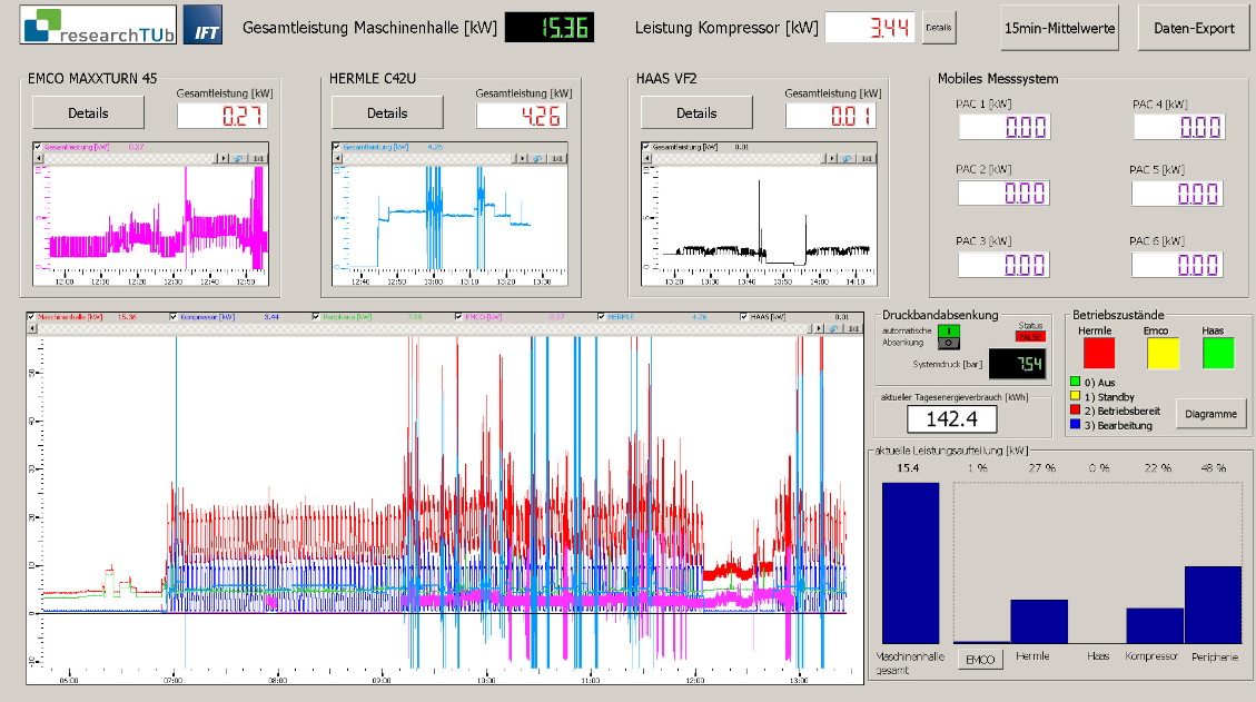 The Pilotfabrik of TU Wien is monitored for energy-efficiency and productivity of machinery. In principle, certain conditions/parameters are observed such as: electric rate of energy transfer, transmission of cooling liquid, transmission of compressed air, acceleration, forces at work and temperatures to research on preventive/predictive maintenance, quality of products and ultimately process efficiency and -productivity.